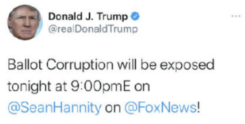 除此之外,特朗普发推称,“选票腐败”将在今晚九点福克斯新闻主持人肖恩·汉尼蒂的节目上被揭露。