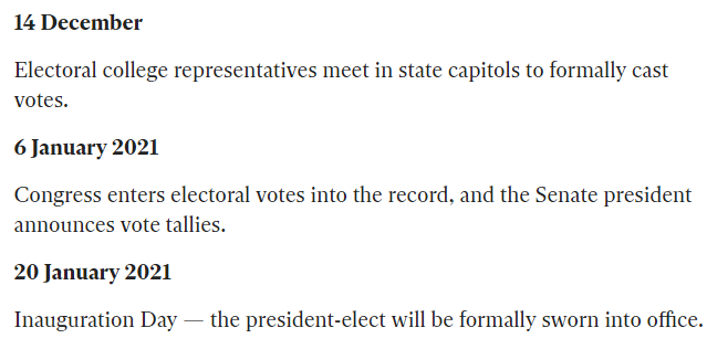 12月14日,选举人投票日。所有州的选举人将进行无记名投票,确认最终总统和副总统人选的归属。