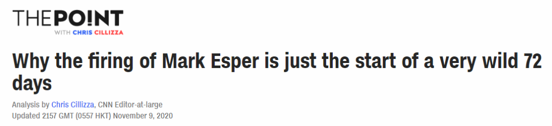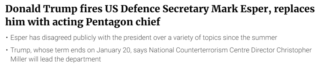 我在上文提到,败选后的特朗普宣布解除国防部长马克·埃斯珀的职务,该职将有特朗普支持者、原国家反恐中心主人米勒取代。