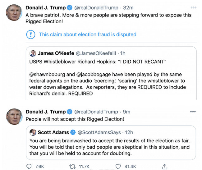 与此同时,特朗普在推特上转发了多条消息,包括美国邮政局检举者Richard Hopkins发布的视频、Federalist网站发表的有关费城选举舞弊情况的文章以及有关奥巴马政府对特朗普的非法间谍和泄密行动等。
