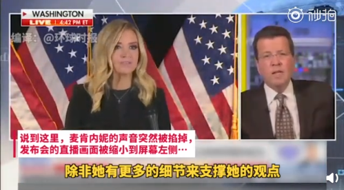 11月9日,白宫新闻秘书麦肯内妮召开的记者会,这名发言人正在讲话,声音突然被掐掉,现场直播画面被缩小到屏幕左侧。