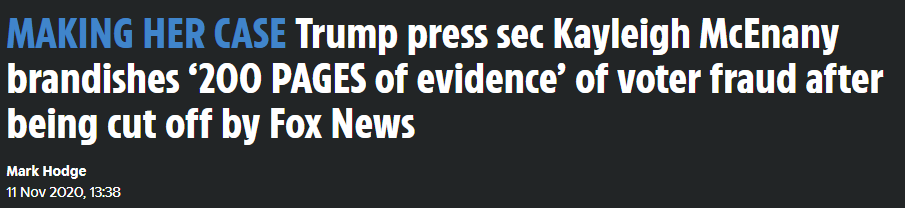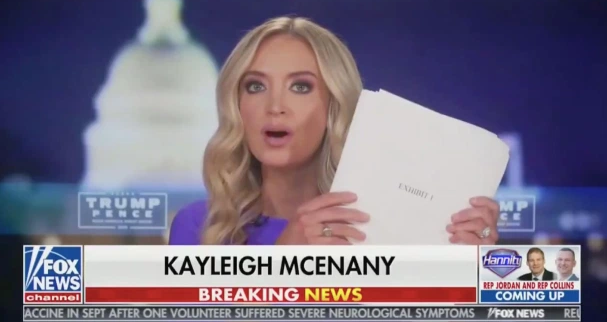 在随后的节目中,白宫新闻发言人凯利·麦肯内妮向观众挥舞并翻动了一大叠纸质文件。她表示这是234页宣誓过的书面证词,可以证明此次大选存在选举舞弊。