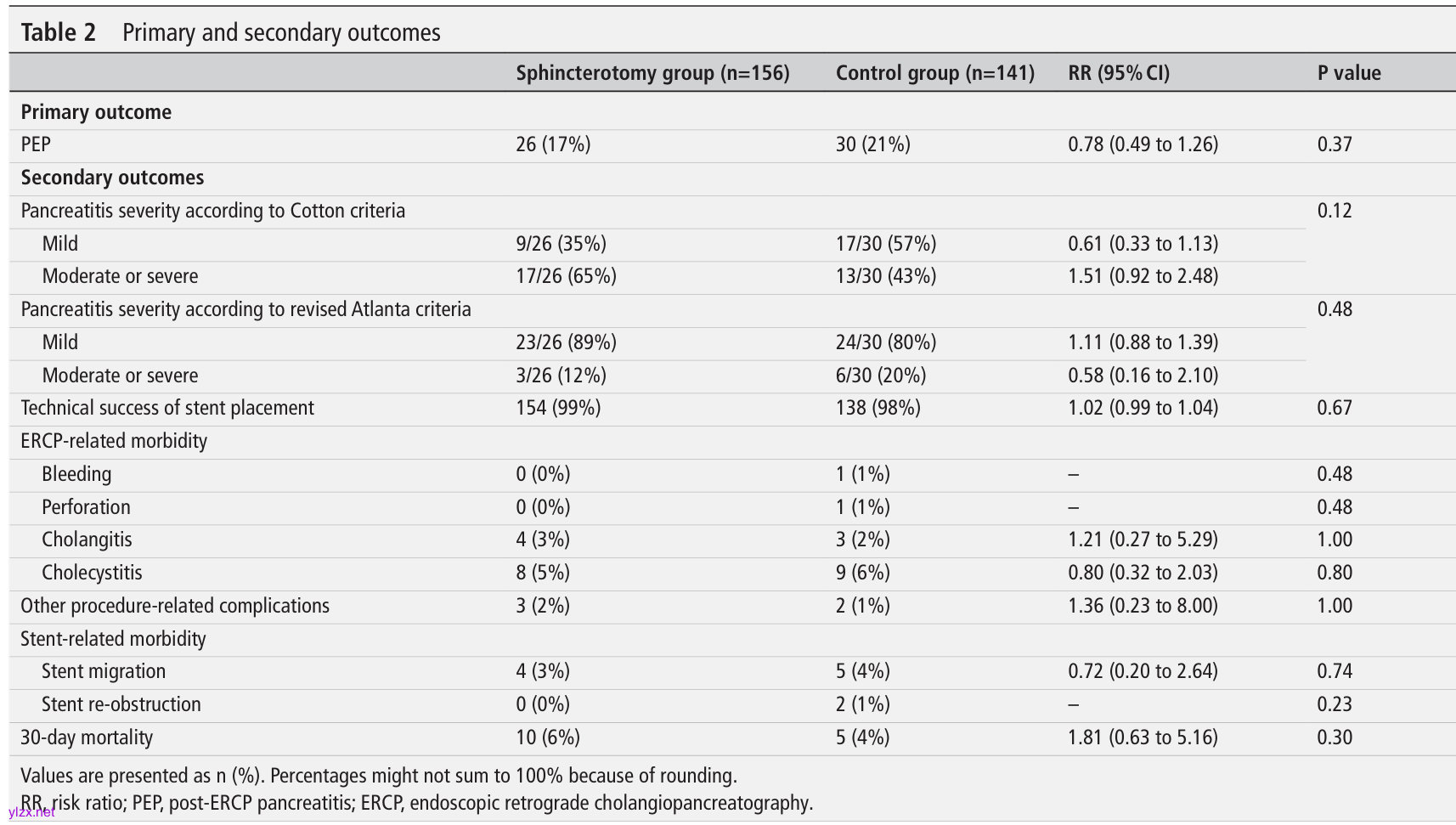 从2016年5月到2023年6月,共有297名患者被纳入ITT分析,其中括约肌切开组156名,对照组141名。然而,在完成中期分析后,由于无效性(futility),研究被提前终止。结果显示,PEP的发生率在两组之间没有显著差异。具体而言,括约肌切开组中有26例(17%)发生PEP,而对照组中有30例(21%)发生PEP,相对风险为0.78(95% CI 0.49–1.26,p=0.37)。这表明EST并未显著降低PEP的风险。此外,两组在其他次要终点方面也未显示出明显差异,包括出血、穿孔、胆管炎、胆囊炎以及30天内的死亡率。进一步的亚组分析显示,无论患者的年龄、性别、基础疾病状态(如是否存在胰腺炎病史)如何,EST在降低PEP风险方面的效果均不显著。这进一步支持了研究的主要结论,即EST并不优于不进行EST。