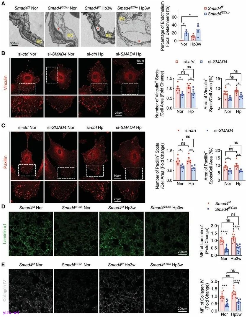 体内外实验结果表明,内皮细胞特异性Smad4缺失可诱发多重病理改变:一方面显著增加内皮细胞衰老和凋亡率,促进病理性血管新生和血管炎症反应—这些表型与既往报道的BMPR2缺失所致肺高压的病理机制高度相似。值得注意的是,本研究首次揭示Smad4缺失破坏血管内皮细胞间的紧密连接和细胞基底膜结构并显著减弱内皮细胞-基质黏附能力,由此导致血管屏障功能受损,表现为通透性异常增加,并且促进炎症细胞向血管壁浸润。这些新发现的机制共同构成了Smad4缺失诱导肺高压的独特病理特征。