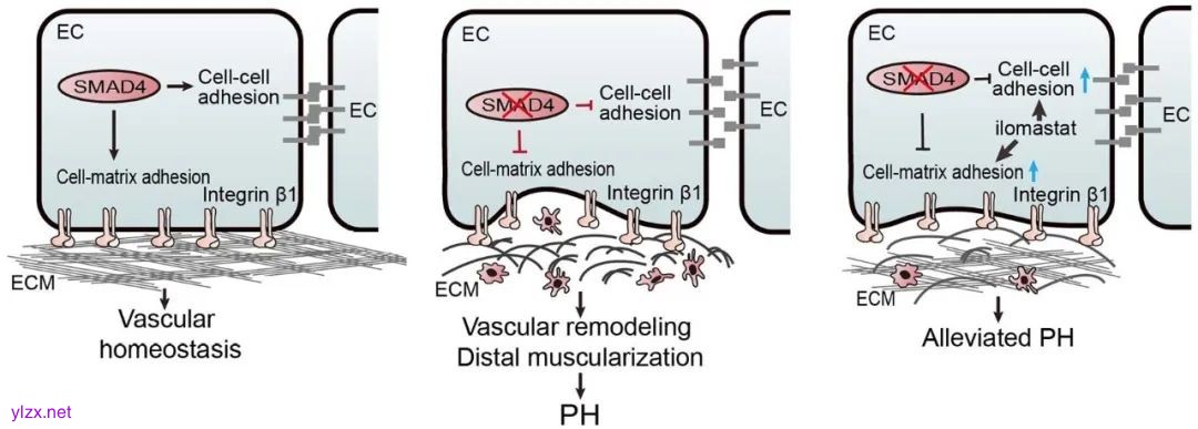 综上所述,本研究揭示内皮细胞(EC)而非平滑肌细胞SMAD4信号缺失驱动肺高压发生。机制上,内皮Smad4缺失破坏细胞间连接和细胞-基质黏附,导致ECM结构紊乱,促进血管重塑。重要的是,增强内皮黏附性和ECM稳定性可改善PH病理表型,提示其作为潜在治疗靶点的价值。