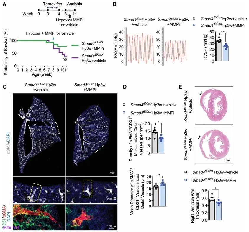 为了深入阐明内皮细胞黏附功能障碍在肺高压发病中的关键作用,研究团队开展了一系列机制验证实验。首先,通过在内皮细胞中特异性敲除细胞黏附关键分子Integrin β1,研究者成功构建了新的肺高压动物模型。该模型表现出与内皮细胞Smad4缺失小鼠高度相似的表型特征,包括右心室收缩压升高、肺血管重塑加重等典型肺高压病理改变,这一结果直接证实了内皮细胞黏附功能受损在肺高压发病中的重要作用。更为重要的是,研究团队发现通过注射基质金属蛋白酶(MMP)抑制剂来增强细胞外基质稳定性,能够显著延缓内皮细胞Smad4缺失诱导的肺高压进展。这些发现不仅确立了Smad4介导的内皮细胞黏附性在肺高压发病机制中的重要角色,也为开发靶向改善内皮黏附和基质稳定的新型治疗策略提供了重要实验依据。