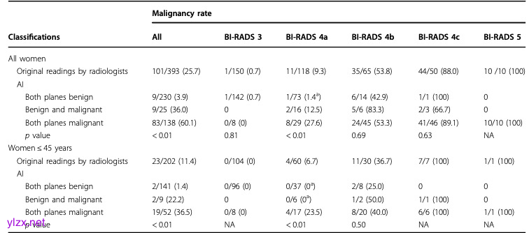表 根据BI-RADS评估类别,放射科医生的原始读数和AI分类在两个正交平面上的恶性肿瘤率