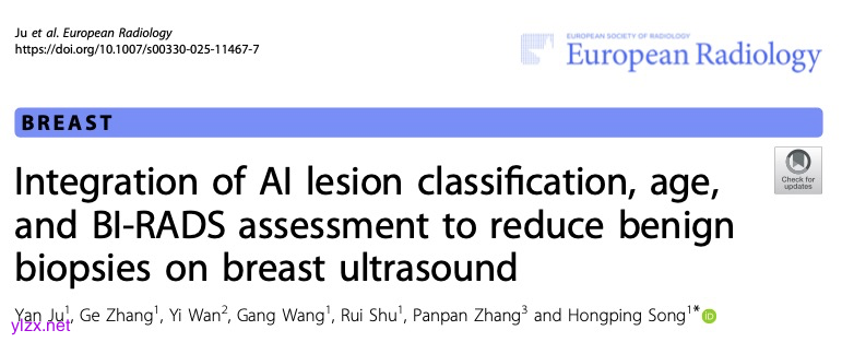 Yan Ju,Ge Zhang,Yi Wan,et al.Integration of AI lesion classification, age, and BI-RADS assessment to reduce benign biopsies on breast ultrasound.DOI:10.1007/s00330-025-11467-7