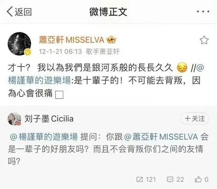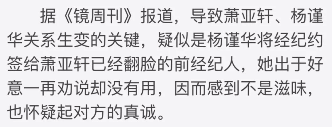 讨论最多的是台媒放出的消息:导致二人关系生变的关键,是杨谨华把经纪约签给了萧亚轩已经翻脸的前经纪人。