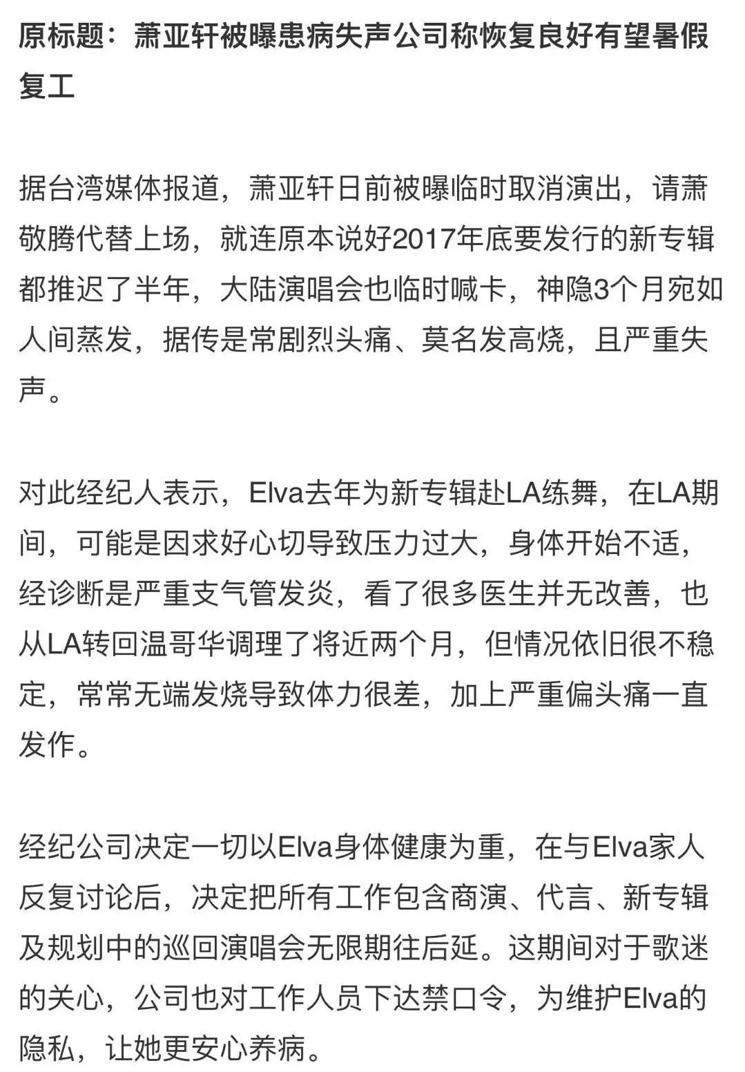 当年台媒报导,萧亚轩身体不适,经常剧烈头痛、莫名发高烧、严重失声。