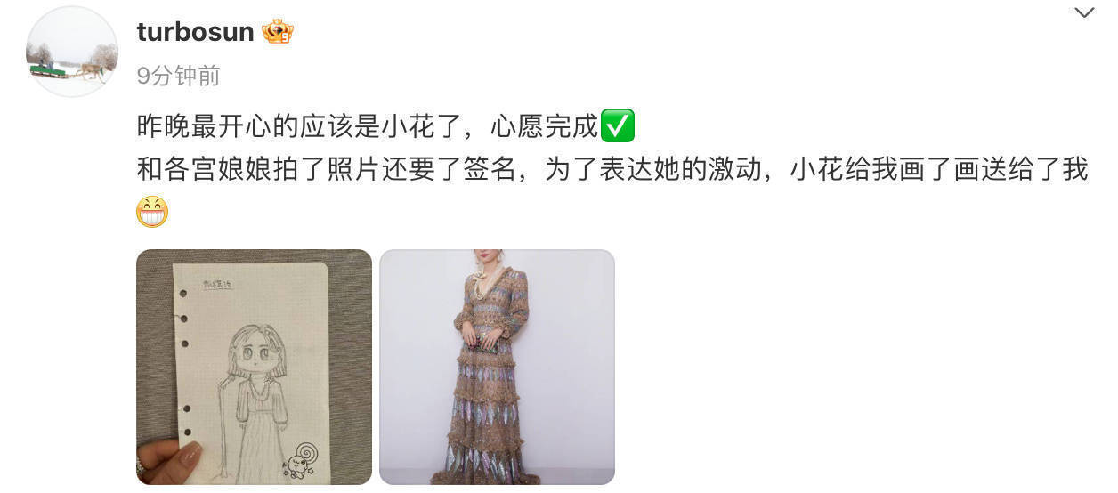 1月12日,孙俪发文称昨晚《甄嬛传》晚会最开心的应该是女儿小花,她和各宫娘娘拍了照片还要了签名,为了表达她的激动,小花还给孙俪画了画。
