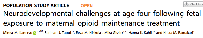 Minna M. Kanervo, Sarimari J. Tupola, et al, Neurodevelopmental challenges at age four following fetal exposure to maternal opioid maintenance treatment, Pediatric Research, 2025, https://doi.org/10.1038/s41390-025-04029-6.