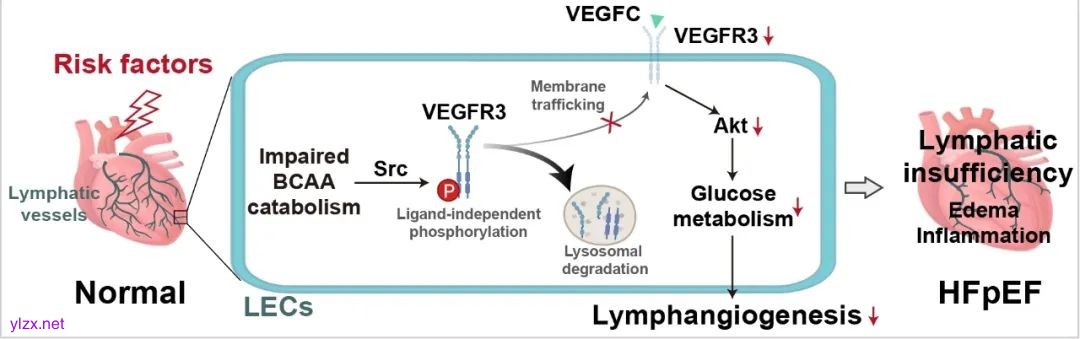 图4. LEC支链氨基酸代谢障碍驱动心脏淋巴管退化性病变和HFpEF机制图