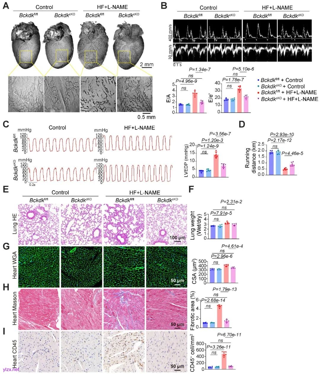 图3. 增强LEC的支链氨基酸分解代谢改善心脏淋巴管退化性病变和HFpEF