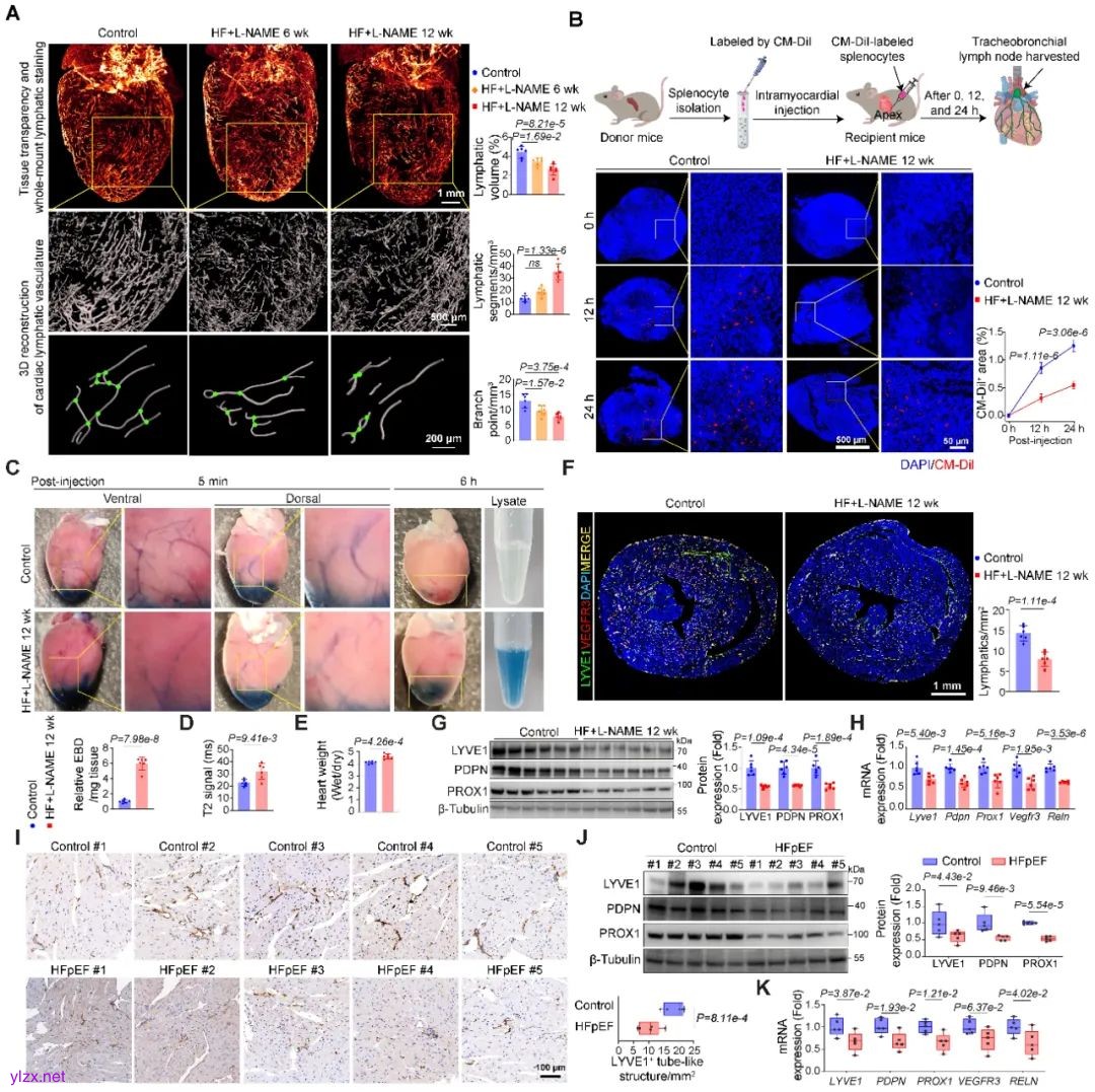 首先,研究者发现,在肥胖和高血压双重打击下的HFpEF小鼠中,心脏淋巴管出现明显的结构破坏和功能减退,表现为LEC密度降低、淋巴管断裂、分支连接减少以及引流组织液和炎细胞的能力明显受损。此外,HFpEF患者心脏组织中的LEC数量和相关标志物表达水平也显著降低(图1)。在肥胖和高血压双重打击HFpEF小鼠模型中,在心脏舒张功能障碍和运动能力下降之前就出现上述心脏淋巴结构和功能异常,表明心脏淋巴管退化性病变是HFpEF进展的早期事件。HFpEF小鼠心脏淋巴管对组织液和炎细胞的引流能力受损,这可能是导致HFpEF心脏水肿和慢性炎症的原因。HFpEF心脏淋巴管退化性病变与既往观察到的HFrEF心脏代偿性淋巴管生成形成鲜明对比,提示心脏淋巴管退化性病变是HFpEF明显区别于HFrEF的独特病理特征。
