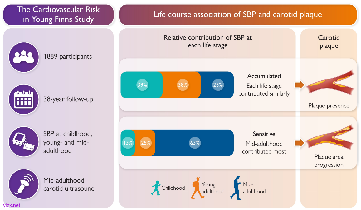 近日,心血管领域权威杂志Eur Heart J上发表了一篇研究文章,该研究的样本纳入了1889名来自芬兰青年心血管风险研究的参与者,他们在童年(6-18岁)、青年(21-39岁)和中年(40-56岁)测量了血压。结果是成年中期颈动脉斑块的有无和面积。研究人员使用贝叶斯相关生命过程暴露模型来估计血压与颈动脉斑块的生命过程关联,并确定每个生命阶段的相对贡献。
