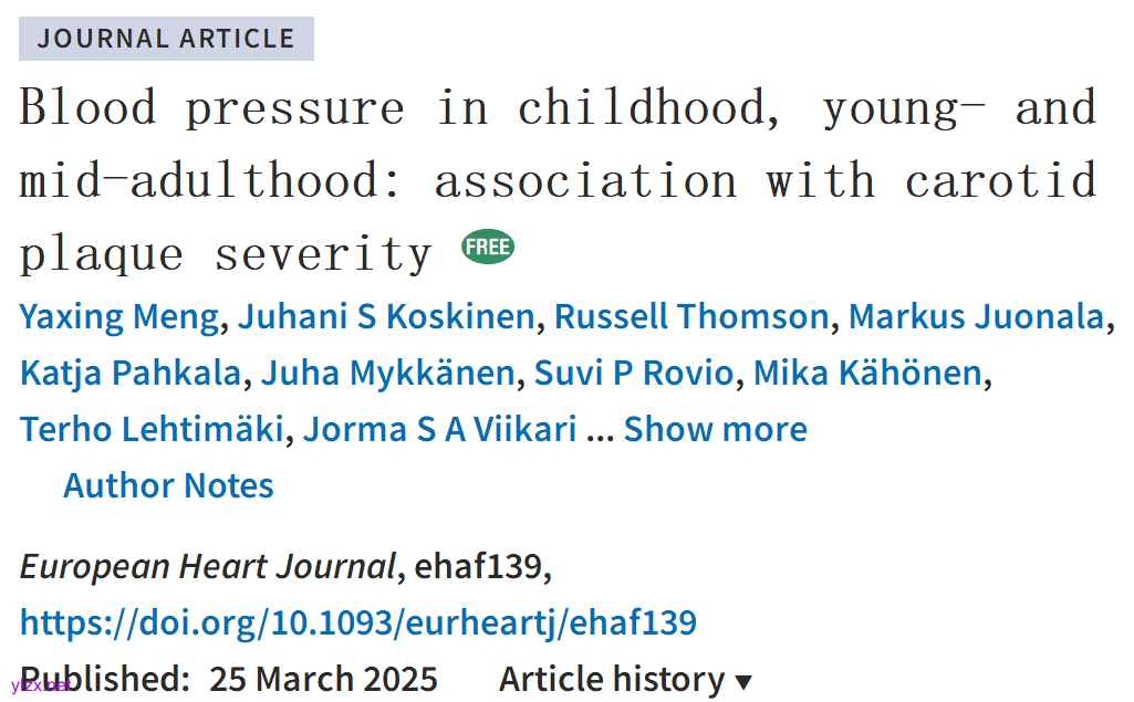 Yaxing Meng,et al.Blood pressure in childhood, young- and mid-adulthood: association with carotid plaque severity.European Heart Journal.2025.https://academic.oup.com/eurheartj/advance-article/doi/10.1093/eurheartj/ehaf139/8093395
