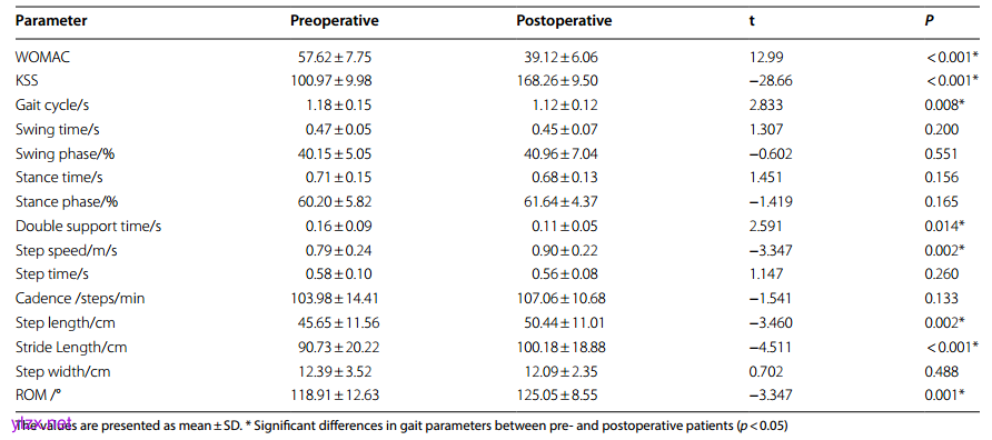 UKA患者术前和术后膝关节评分和步态参数的比较
