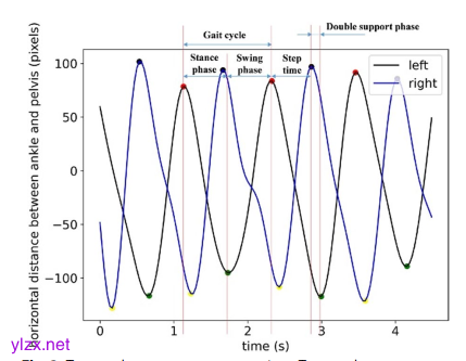 时间参数表示。根据最大值(脚跟触地事件)和最小值(脚趾离地事件)之间的时间差计算时间参数