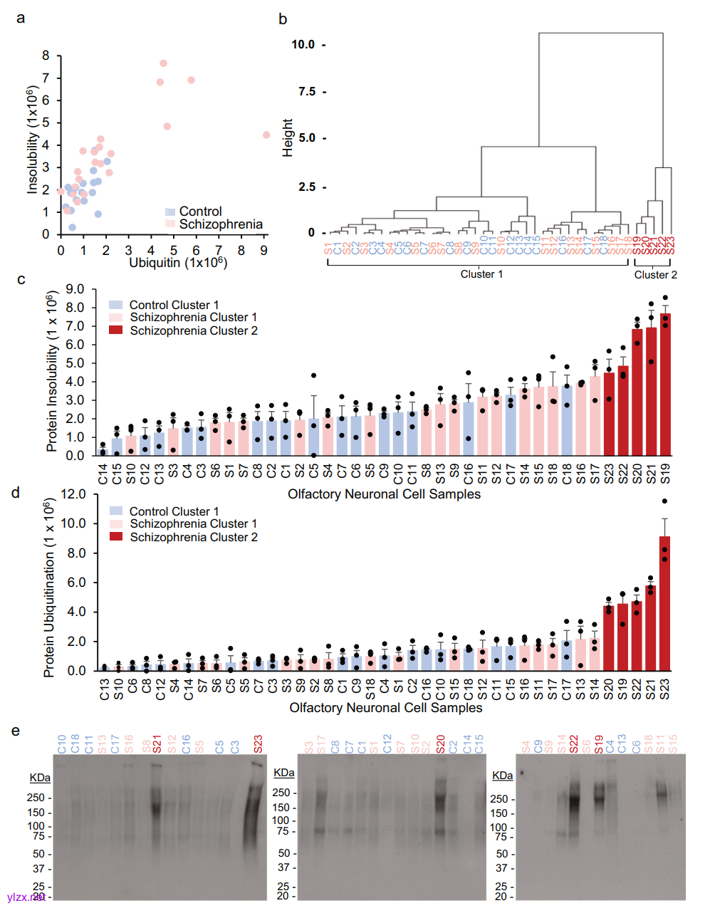 图1:嗅觉神经元细胞中蛋白不溶性和泛素化水平的聚类分析及定量结果