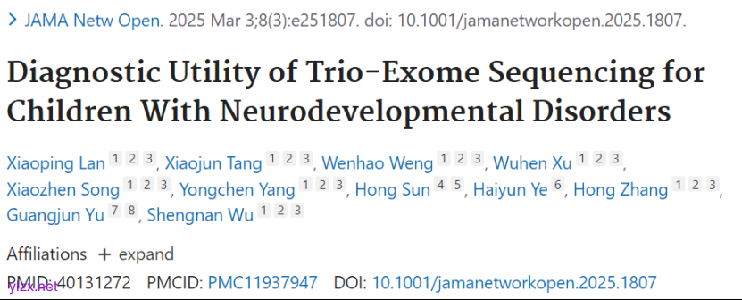 Lan X, Tang X, Weng W, Xu W, Song X, Yang Y, Sun H, Ye H, Zhang H, Yu G, Wu S. Diagnostic Utility of Trio-Exome Sequencing for Children With Neurodevelopmental Disorders. JAMA Netw Open. 2025 Mar 3;8(3):e251807. doi: 10.1001/jamanetworkopen.2025.1807. PMID: 40131272; PMCID: PMC11937947.