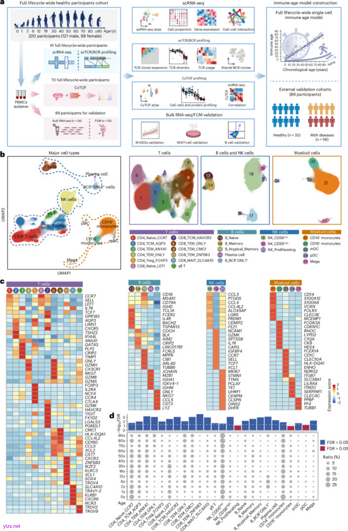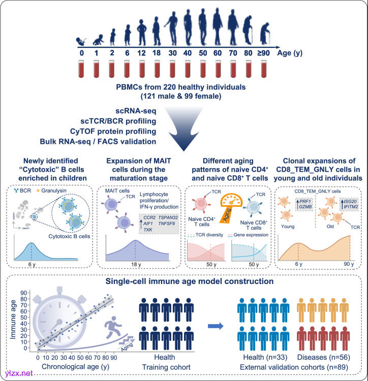 Nature Immunology:我国学者将单细胞 RNA 和 T 细胞/B 细胞受体测序与质谱流式细胞术相结合,揭示人类外周免疫细胞从出生到老年的动态轨迹
