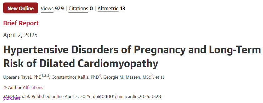 Upasana Tayal,et al.Hypertensive Disorders of Pregnancy and Long-Term Risk of Dilated Cardiomyopathy.JAMA Cardiol. 2025.https://jamanetwork.com/journals/jamacardiology/article-abstract/2824469