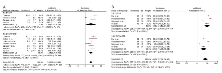 研究纳入所有对胸痛患者进行评估的研究,这些研究单独使用 CTP 联合冠状动脉计算机断层血管造影(CCTA),或者将其与 CCTA 进行对比。主要分析纳入了比较 CCTA 联合 CTP 与单独使用 CCTA 的研究,而在次要分析中,我们分析了全部 7 项研究(包括双臂研究和单臂研究)中各项结局的发生率。