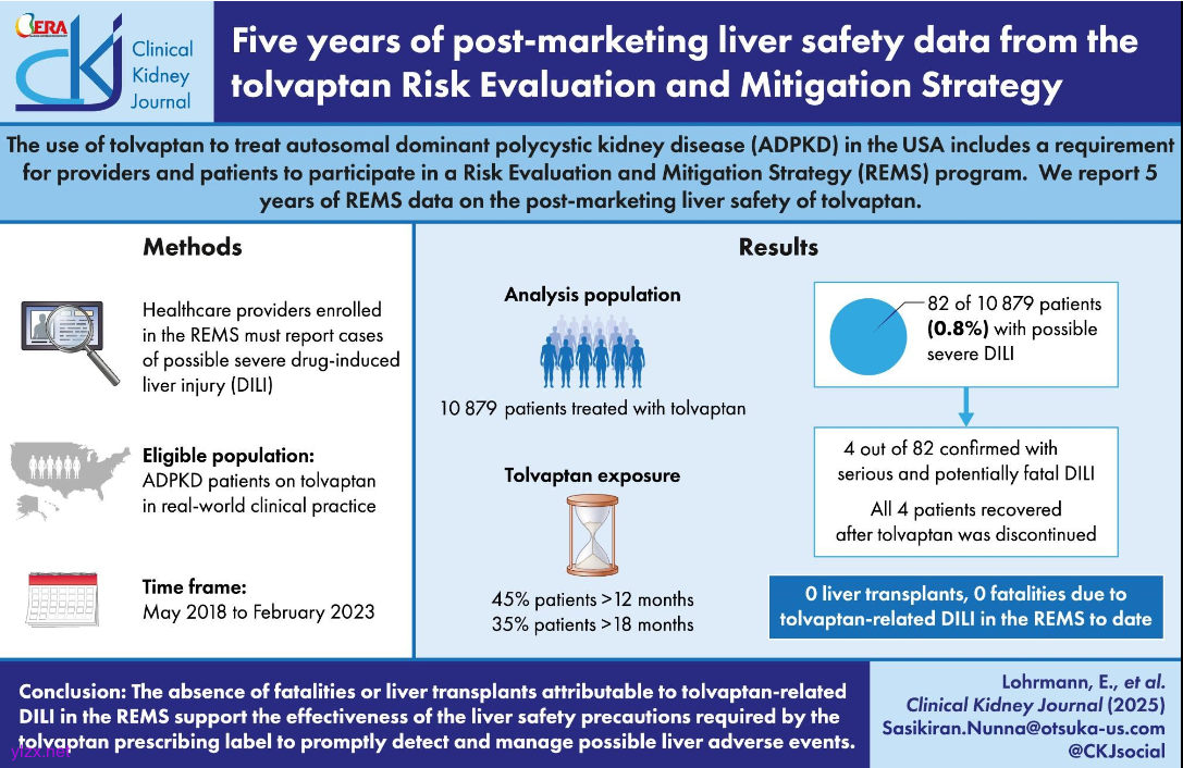 常染色体显性多囊肾病(ADPKD)是一种遗传性肾脏疾病,以囊肿增殖和肾功能进行性恶化为特征。托伐普坦(tolvaptan)作为血管加压素V2受体拮抗剂,可通过抑制细胞外信号调节激酶(ERK)通路延缓囊肿生长,被批准用于快速进展型ADPKD的治疗。然而,临床试验中观察到托伐普坦可能引发药物性肝损伤(DILI),表现为肝酶升高甚至急性肝衰竭。美国食品药品监督管理局(FDA)要求实施风险评估与缓解策略(REMS),强制实施严格的肝功能监测计划以确保用药安全。本研究基于美国REMS项目5年随访数据,旨在评估托伐普坦在真实世界中的长期肝脏安全性,比较其与临床试验的DILI发生率差异,并验证现行月度监测方案的有效性。