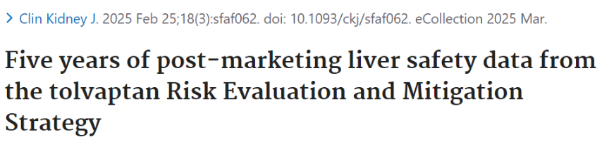 Lohrmann E, Jaeger T, Enekebe K, Zhang Z, Wilt T, Riggen M, Stemhagen A, Nair I, Nunna S, Fernandes AW, Gandhi H, Sergeyeva O, George V. Five years of post-marketing liver safety data from the tolvaptan Risk Evaluation and Mitigation Strategy. Clin Kidney J. 2025 Feb 25;18(3):sfaf062. doi: 10.1093/ckj/sfaf062. PMID: 40130227; PMCID: PMC11932340.