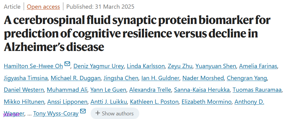 Oh, H.SH., Urey, D.Y., Karlsson, L. et al. A cerebrospinal fluid synaptic protein biomarker for prediction of cognitive resilience versus decline in Alzheimer’s disease. Nat Med (2025). https://doi.org/10.1038/s41591-025-03565-2