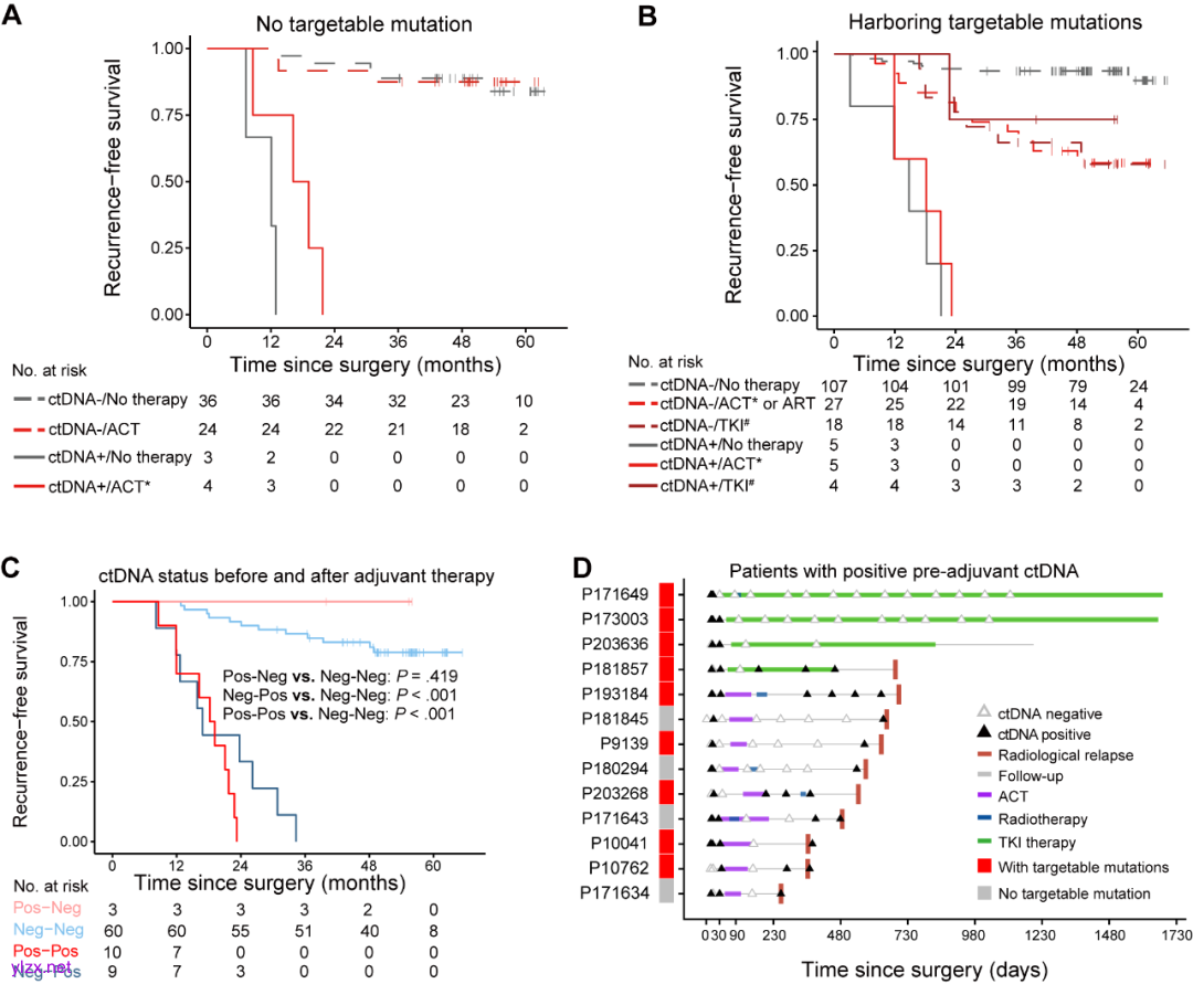 为了明确ctDNA检测是否有助于辅助治疗方案的决策,研究团队根据患者原发肿瘤组织是否携带可靶向突变,评估了不同基因型亚组中辅助治疗前ctDNA状态与不同治疗方案下疗效的相关性。在67例无可靶向突变的患者中,辅助化疗(ACT)未能显著延长辅助治疗前ctDNA阳性人群的无复发生存期(RFS)(中位RFS:17.7个月 vs 12.1个月;HR=0.2,P=0.093)。无论是否接受ACT,辅助治疗前ctDNA阴性患者的RFS也相似(HR=0.9,P=0.933)。在166例原发肿瘤组织携带可靶向突变的患者中,14例为辅助治疗前ctDNA阳性,其中4例接受TKI治疗,5例接受ACT,5例未接受辅助治疗。TKI治疗组仅有1例(25%)复发,而其他两组复发率均为100%。与未治疗组相比,TKI治疗显著改善RFS(HR=0.01,P=0.005),但ACT未能改善该亚组患者的RFS(HR=0.6,P=0.491)(图3)。这些结果表明辅助治疗前ctDNA状态与肿瘤突变联合分析可预测不同辅助治疗方案的疗效。