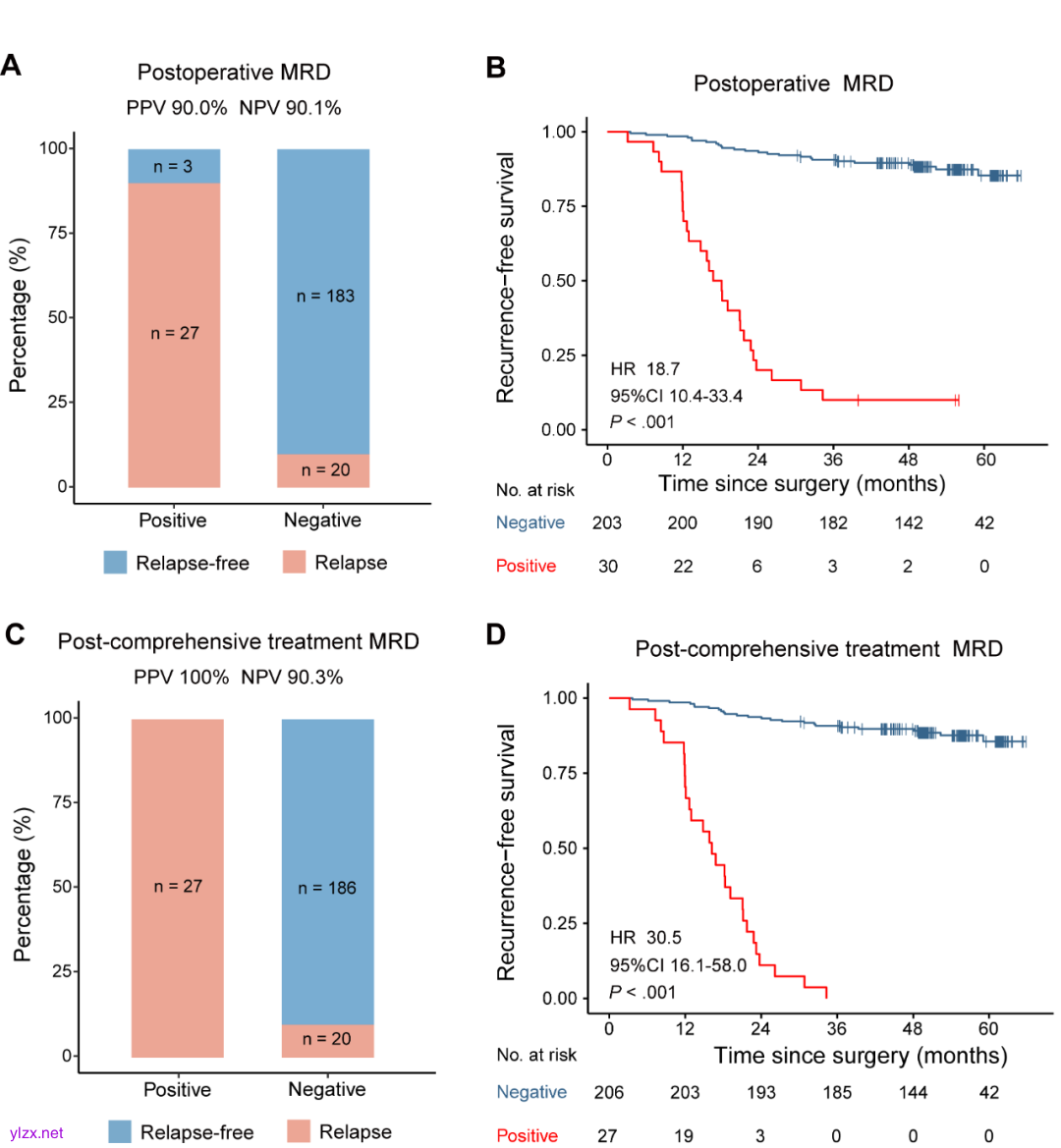 研究团队首先比较了术后MRD状态与综合治疗(根治性手术+必要辅助治疗)后MRD状态在预测疾病复发方面的效能是否存在差异。术后MRD阳性的30位患者,27位在术后三年内复发,PPV为90.0%;203位MRD阴性的患者中有183位未复发,NPV为90.1%;术后MRD阳性患者RFS显著较差 (HR = 18.7, 95% CI = 10.4-33.4, P <0 .001)。综合治疗(根治性手术+必要辅助治疗)后MRD阳性的27位患者术后3年内全部复发,PPV达100%;综合治疗后MRD阴性的206位患者中有186位一直未复发,NPV为90.3%;综合治疗后MRD阳性患者RFS显著更差 (HR = 30.5, 95% CI = 16.1-58.0, P <0 .001)(图2)。 以上结果说明术后MRD预测复发具有较高的阳性预测值和阴性预测值,而综合治疗后MRD因纳入了辅助治疗的影响,能判断患者最终是否复发。