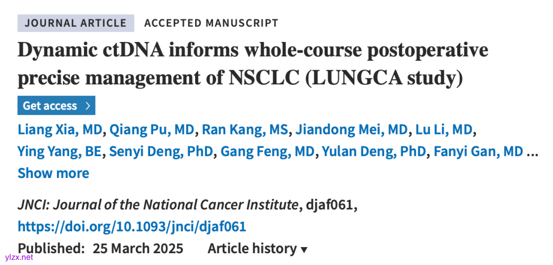3. Xia L, Pu Q, Kang R, et al. Dynamic ctDNA informs whole-course postoperative precise management of NSCLC (LUNGCA study), JNCI: Journal of the National Cancer Institute, 2025;, djaf061, https://doi.org/10.1093/jnci/djaf061.