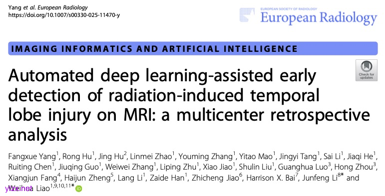 Fangxue Yang,Rong Hu,Jing Hu,et al.Automated deep learning-assisted early detection of radiation-induced temporal lobe injury on MRI: a multicenter retrospective analysis.DOI:10.1007/s00330-025-11470-y
