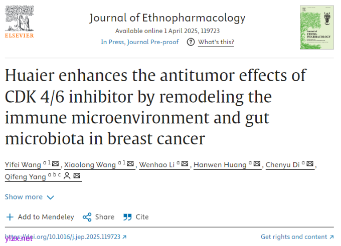 Wang Y, Wang X, Li W, Huang H, Di C, Yang Q. Huaier enhances the antitumor effects of CDK 4/6 inhibitor by remodeling the immune microenvironment and gut microbiota in breast cancer. J Ethnopharmacol. Published online April 1, 2025. doi:10.1016/j.jep.2025.119723