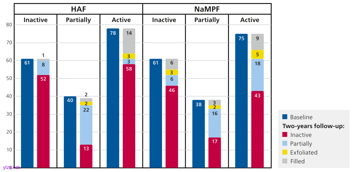 两组乳牙列基线期及两年随访期牙釉质病变活动性比较
