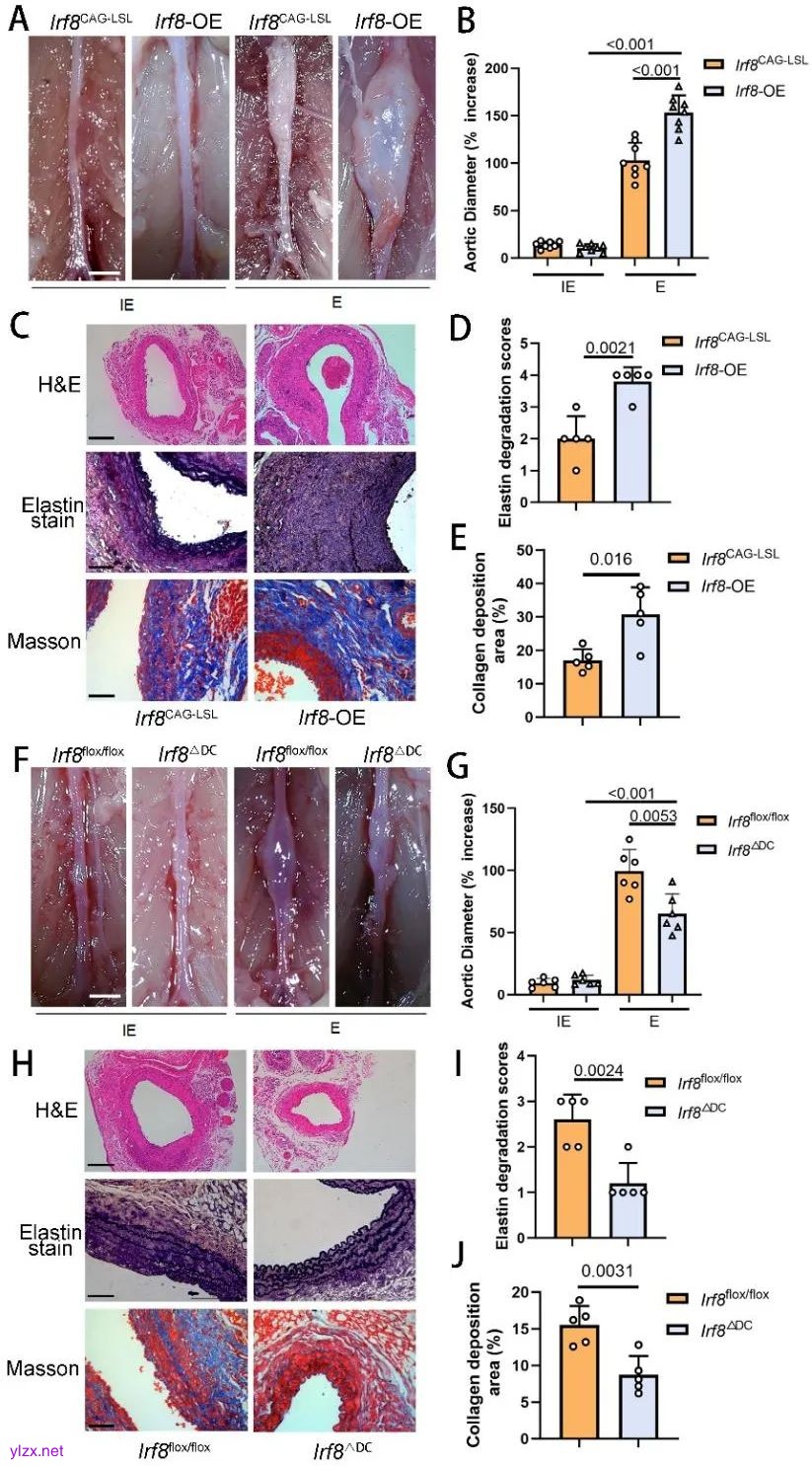 鉴于在人类和小鼠AAA样本中均观察到IRF8的表达上调,研究团队构建了Irf8CAG-LSLItgaxCre小鼠(Irf8-OE),发现该组AAA的扩张程度显著高于对照组。病理检查结果显示,与健康腹主动脉相比,Irf8-OE组表现出明显扩张的主动脉腔、破坏的多层弹性蛋白结构以及增加的胶原沉积。此外,IRF8的缺失(Irf8flox/floxItgaxCre小鼠,Irf8ΔDC)显著抑制了AAA的扩张,病变区域病理变化轻微,几乎无明显炎症细胞浸润和胶原沉积。