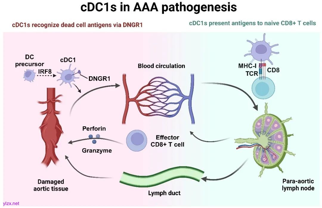 综上所述,IRF8通过促进cDC1细胞的分化以及激活CD8+ T细胞,导致主动脉壁的破坏,在AAA的发生发展中起着关键作用。这些发现加深了我们对AAA免疫病理机制的理解,并提示针对IRF8介导的免疫应答途径可能成为治疗AAA的潜在策略。
