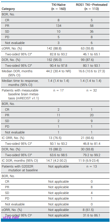 截至2024年6月7日,TRUST-I和TRUST-II试验共纳入273例患者。在TKI初治患者中(n=160),cORR为88.8%,IC-cORR为76.5%;在TKI预处理患者中(n=113),cORR为55.8%,IC-cORR为65.6%。在TKI初治患者中,中位DOR和中位PFS分别为44.2个月和45.6个月;在TKI预处理患者中,中位DOR和中位PFS分别为16.6个月和9.7个月。在携带G2032R突变的患者中,cORR为61.5%。