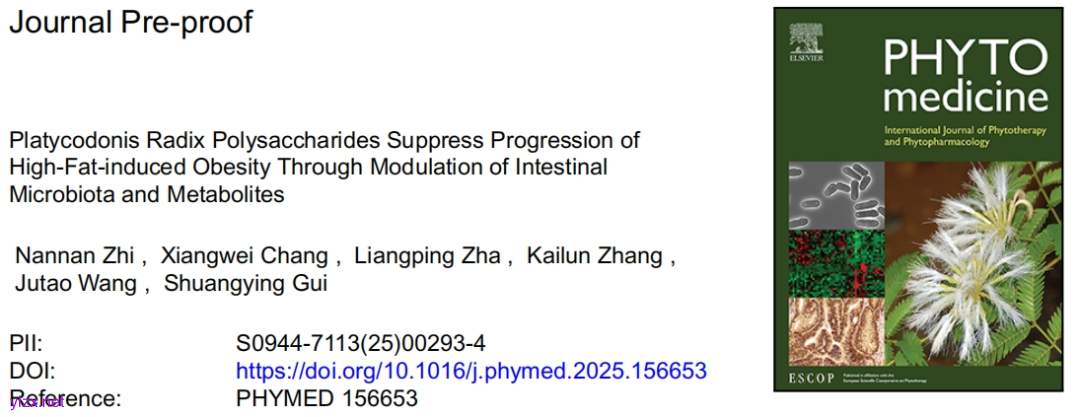 Nannan Zhi , Xiangwei Chang , Liangping Zha , Kailun Zhang ,Jutao Wang , Shuangying Gui.Platycodonis Radix Polysaccharides Suppress Progression of High-Fat-induced Obesity Through Modulation of Intestinal Microbiota and Metabolites.Phytomedicine.https://doi.org/10.1016/j.phymed.2025.156653
