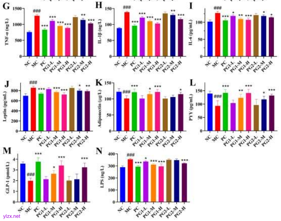 血清激素水平受PG影响的情况如图4J-M所展示。在MC组中,HFD饮食导致瘦素水平显著上升,而脂联素、PYY和GLP-1水平显著下降。PG治疗,尤其是PG1治疗,有效地缓解了这些变化。相较于MC组,PG1-H干预使得瘦素含量减少了15.68%,同时脂联素、PYY和GLP-1水平分别提升了19.84%、51.50%和72.11%。PG1在改善血清激素水平方面的效果明显优于PG2。