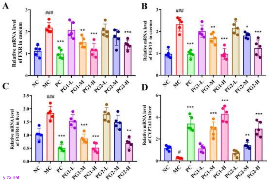 图6A-D揭示,HFD显著提升了盲肠中法尼酯X受体(FXR)和成纤维细胞生长因子15(FGF15)的表达水平,同时增加了成纤维细胞生长因子受体4(FGFR4)的表达,并导致肝脏中胆固醇7α-羟化酶(CYP7A1)的表达减少。然而,高剂量的PG1干预显著逆转了这些变化趋势。