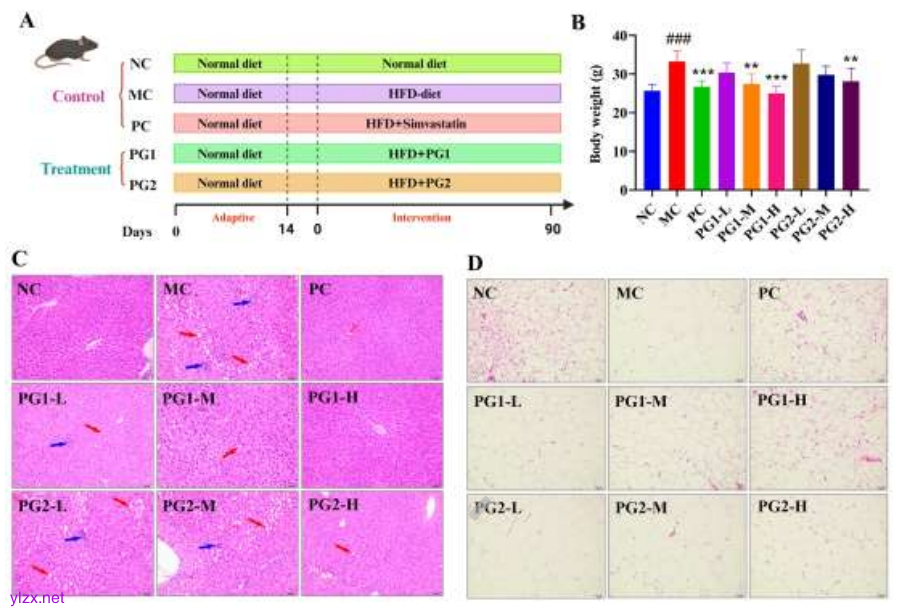 具体实验步骤参考图2A,在90天的观察期后,MC组小鼠的体重增长超过了NC组,相较于MC组,高剂量的PG1和PM2治疗显著抑制了体重的增加。尤其是高剂量PG1在减轻体重方面几乎与辛伐他汀具有同等的效力(图2B)。HE染色技术展示了HFD诱导的肝组织病理变化(图2C)。结果显示,MC组小鼠的肝细胞显示出严重的空泡变性、肝索排列紊乱、肝细胞坏死以及炎症细胞浸润。但高剂量PG1治疗后,肝细胞形态恢复正常,肝索排列变得均匀。在缓解HFD引起的肝脏组织病理变化方面,PG1比PG2更为有效。如图2D所示,MC组小鼠的脂肪细胞体积较大。值得注意的是,PG1-H组的脂肪细胞体积有所减小,与NC组和PC组观察到的减小趋势一致。
