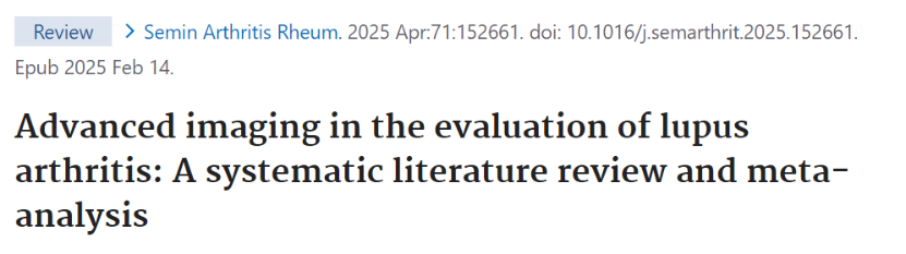 Tang W, Khalili L, Gong R, Souvignier M, Wang X, Murray S, Chavez GR, Nordmann-Gomes A, Geraldino-Pardilla L, Gartshteyn Y, Clancy R, Nikpour M, Askanase A. Advanced imaging in the evaluation of lupus arthritis: A systematic literature review and meta-analysis. Semin Arthritis Rheum. 2025 Apr;71:152661. doi: 10.1016/j.semarthrit.2025.152661. Epub 2025 Feb 14. PMID: 39985848.