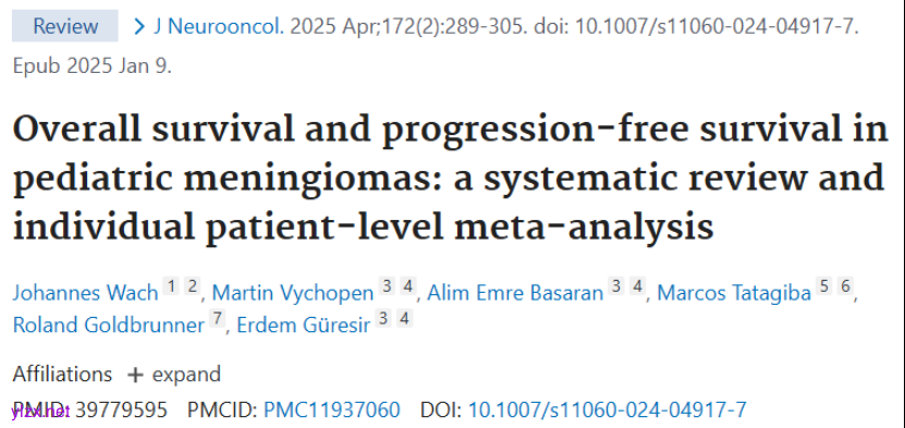 Wach J, Vychopen M, Basaran AE, Tatagiba M, Goldbrunner R, Güresir E. Overall survival and progression-free survival in pediatric meningiomas: a systematic review and individual patient-level meta-analysis. J Neurooncol. 2025 Apr;172(2):289-305. doi: 10.1007/s11060-024-04917-7. Epub 2025 Jan 9. PMID: 39779595; PMCID: PMC11937060.
