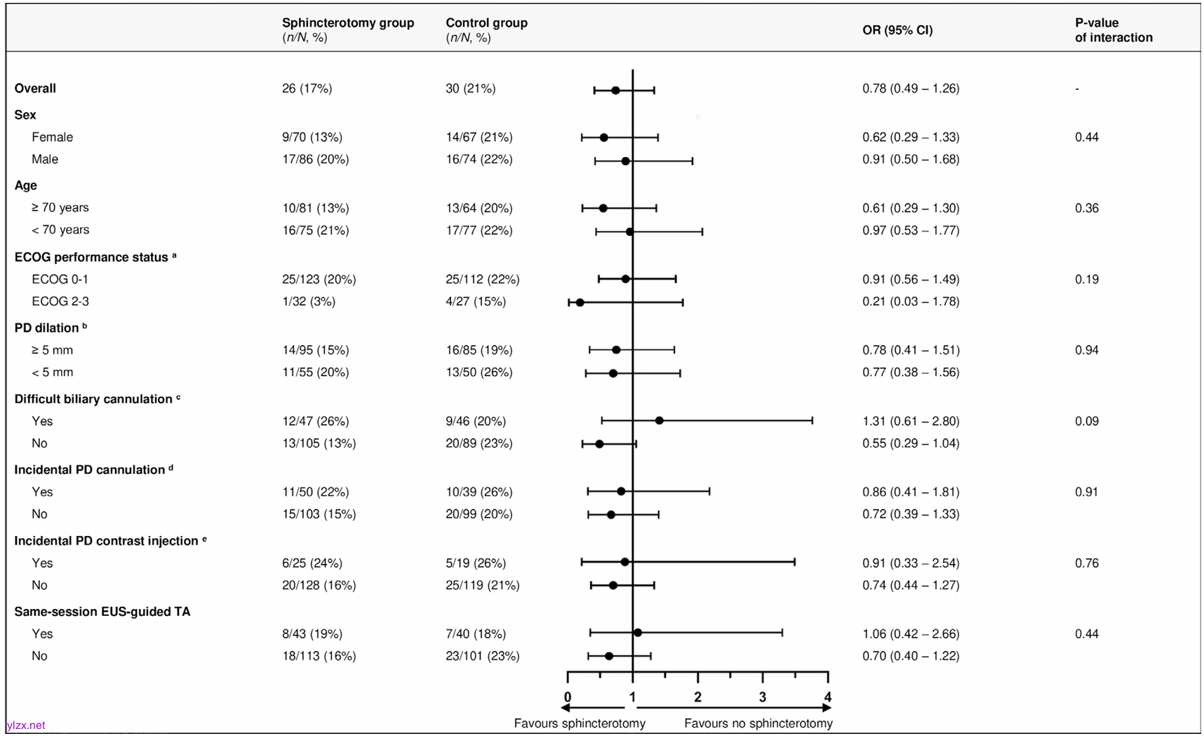 从2016年5月到2023年6月,共有297名患者被纳入ITT分析,其中括约肌切开组156名,对照组141名。然而,在完成中期分析后,由于无效性(futility),研究被提前终止。结果显示,PEP的发生率在两组之间没有显著差异。具体而言,括约肌切开组中有26例(17%)发生PEP,而对照组中有30例(21%)发生PEP,相对风险为0.78(95% CI 0.49–1.26,p=0.37)。这表明EST并未显著降低PEP的风险。此外,两组在其他次要终点方面也未显示出明显差异,包括出血、穿孔、胆管炎、胆囊炎以及30天内的死亡率。进一步的亚组分析显示,无论患者的年龄、性别、基础疾病状态(如是否存在胰腺炎病史)如何,EST在降低PEP风险方面的效果均不显著。这进一步支持了研究的主要结论,即EST并不优于不进行EST。