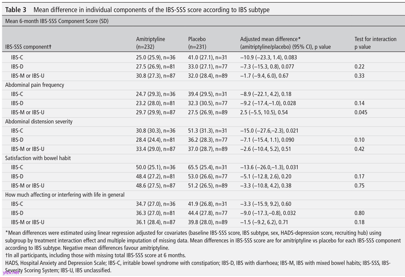 Wright-Hughes A, Ow PL, Alderson SL, Ridd MJ, Foy R, Bishop FL, Chaddock M, Fernandez C, Guthrie EA, Muir DP, Taylor CA, Farrin AJ, Everitt HA, Ford AC. Predictors of response to low-dose amitriptyline for irritable bowel syndrome and efficacy and tolerability according to subtype: post hoc analyses from the ATLANTIS trial. Gut. 2025 Apr 7;74(5):728-739. doi: 10.1136/gutjnl-2024-334490. PMID: 39863398; PMCID: PMC7617491.