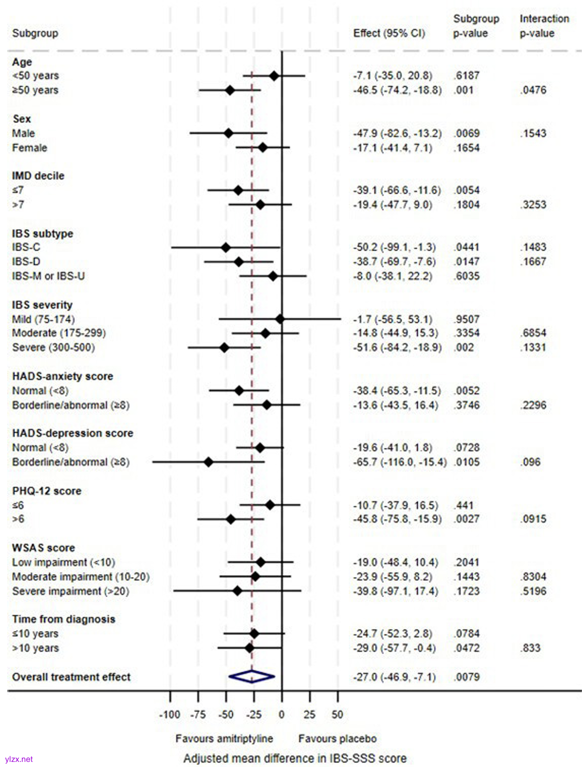 研究发现,阿米替林的疗效在某些亚组中存在显著差异。具体而言:年龄分层:在≥50岁患者中,阿米替林对IBS-SSS评分的改善效果显著优于50岁患者,且主观缓解率更高。社会经济地位:生活在英格兰最贫困70%地区的患者对阿米替林的反应更佳,特别是在腹痛改善方面。性别和心理症状:男性患者、以及PHQ-12评分较高的患者对阿米替林的反应更强。此外,IBS-D亚型患者表现出比其他亚型更强的治疗效果。耐受性:阿米替林的不良反应发生率在几乎所有亚型中与安慰剂组相似,表明其耐受性良好。个体症状分析显示,阿米替林在改善IBS-SSS各组成部分(如腹痛、腹胀、排便满意度等)方面均优于安慰剂,差异具有统计学意义。