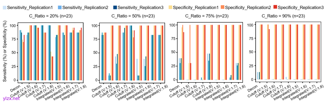 图4. 不同报出阈值下不同颗粒细胞污染SECM样品的敏感性和特异性。